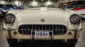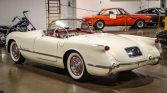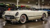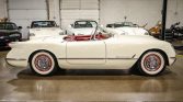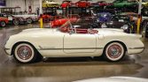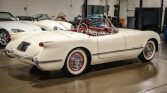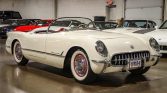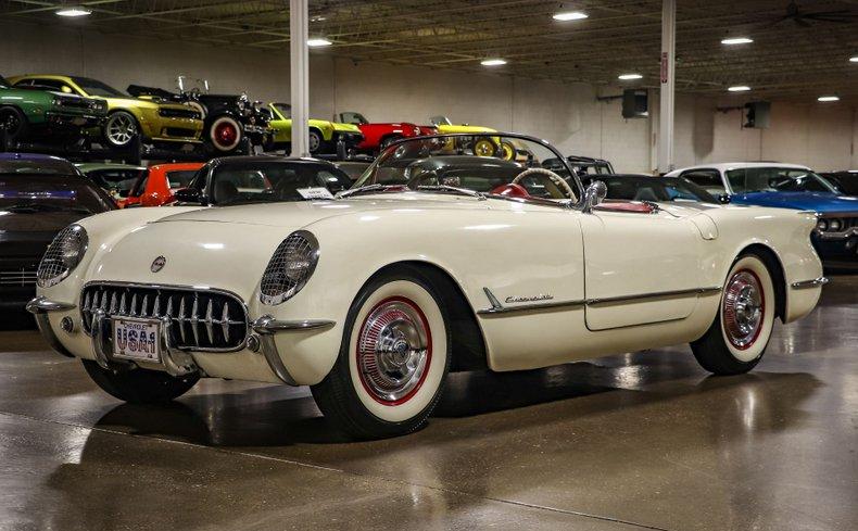 Chevrolet Corvette- Second Year of the First Generation Corvette- 235ci/150hp Blue Flame Inline 6 – Powerglide Automatic Transmission – White Over Red Interior – Recently Serviced by Classic Coachworks- Family Owned for the Past 40 Years- Was featured and displayed at the GM Transmission Plant Toledo, OH on June 29th, 1992 for the One Millionth Corvette Kick-Off- Also featured at GM Headquarters Detroit, MI for the One Millionth Corvette Parade and Display next to GM’s Prototype vehicles including Mako SharkSensational Styling, Luxurious Comfort, and a Power-Packed Chassis were standard on the 1954 Corvette, for those who took the chance to own one of GM’s revolutionary new sports cars. Chevrolet boasted that the Corvette was The First of the Dream Cars to Come True. This particular Corvette has all the right bits; Blue Flame engine, Polo White paint, red interior, whitewalls mounted on red wheels, and of course the timeless styling that has caused so many folks to take a second look. This car is truly easy on the eyes.As with any completely new model and platform, there is a bit of a risk that is taken by manufacturers at the introductory stage. Who would’ve known in 1954 as the first iteration of the Corvette reached its second year of production, that 38 years later the Corvette would reach one million vehicles produced. The Corvette production total is an important thing to consider in the case of this particular car. In 1992 this ’54 Corvette was displayed as part of the One Millionth Corvette celebration. As part of the celebration display at GM Headquarters in Detroit Michigan, this car sat alongside many Corvette production cars, as well as prototypes like the unforgettable Mako Shark. As a 1954 model year car, this car is an early piece of the Corvette legacy. Only 6340 Corvettes were produced for the 1954 model year, and it wasn’t until 1963 that Corvette yearly production surpassed 20k units. Corvettes were not often seen in the early days, which is a stark difference from what we are used to today. This Corvette is finished in the eye-catching factory color combination of white over a red interior, which is the same color combination as the millionth Corvette which rolled off the line in 1992. The technical term for the exterior is Polo White, which was the most common color for the ’54 model year. The revolutionary-at-the-time fiberglass body of this particular car is in very nice condition with doors, trunk lid, and hood lining up as they should. The paint is from an older restoration and has a few chips that have been touched up at the front and the rear of the car. Trim and brightwork is in nice condition, and much of it looks to be original. As to be expected with a highly original, 68 year old car, a few small spots of pitting in the chrome are visible. Friendly, flowing lines of the car are definitely pleasing to the eye, with GM styling cues of the time easy to pick out.Inside the car are simple bucket seats that are enveloped on either side by body lines that flow from the rear of the car into the interior. A simple, elegant dashboard which is finished in Polo White and topped with a red dash pad, houses an array of gauges and switches. A large tachometer sits in the center flanked by fuel, temperature, battery, and oil pressure gauges, and a clock. A sweeping speedometer which is very similar in looks and shape to a mid-50’s Bel Air sits just in front of the driver, on the other side of the thin rimmed steering wheel. Chrome trim inside the car looks to be original, and does show a little bit of pitting. Once seated in this car, it’s clear that this Corvette was built with the idea of creating a luxury sports car. The large steering wheel, door pockets, easily visible gauges, and an AM signal seeking radio complement the luxurious seats, which feature piping and a nod to tuck and roll stitching thanks to the rows of stitching at the center of the seats. A simple factory soft top finished in Beige is in place beneath the fiberglass tonneau cover, however it shows some age. The trunk is upholstered in red, and features a pouch which holds the additional side windows that can be installed when the top is up. Beneath the hood is the Blue Flame 150 inline-6 mated to a 2-speed Powerglide Transmission. A trio of Carter carburetors keep the air/fuel mixture in check. Much like the rest of the car, the engine bay looks to be highly original. In preparation for sale, the engine and supporting mechanicals were gone over by a technician who is very experienced in working on vintage Corvettes. Fresh fluids were added, and a number of new parts were installed including: a new battery, new ignition parts, brake hoses, wheel cylinders front and rear, and the carbs were rebuilt. Whether you’re a fan of Corvette and have owned one of each generation, or you’re looking for a collectible classic with beautiful styling to enjoy. You have to appreciate the vision and the final product which has now become an American Icon. This Corvette which is finished in Polo White over Red interior would make an awesome addition to your collection.